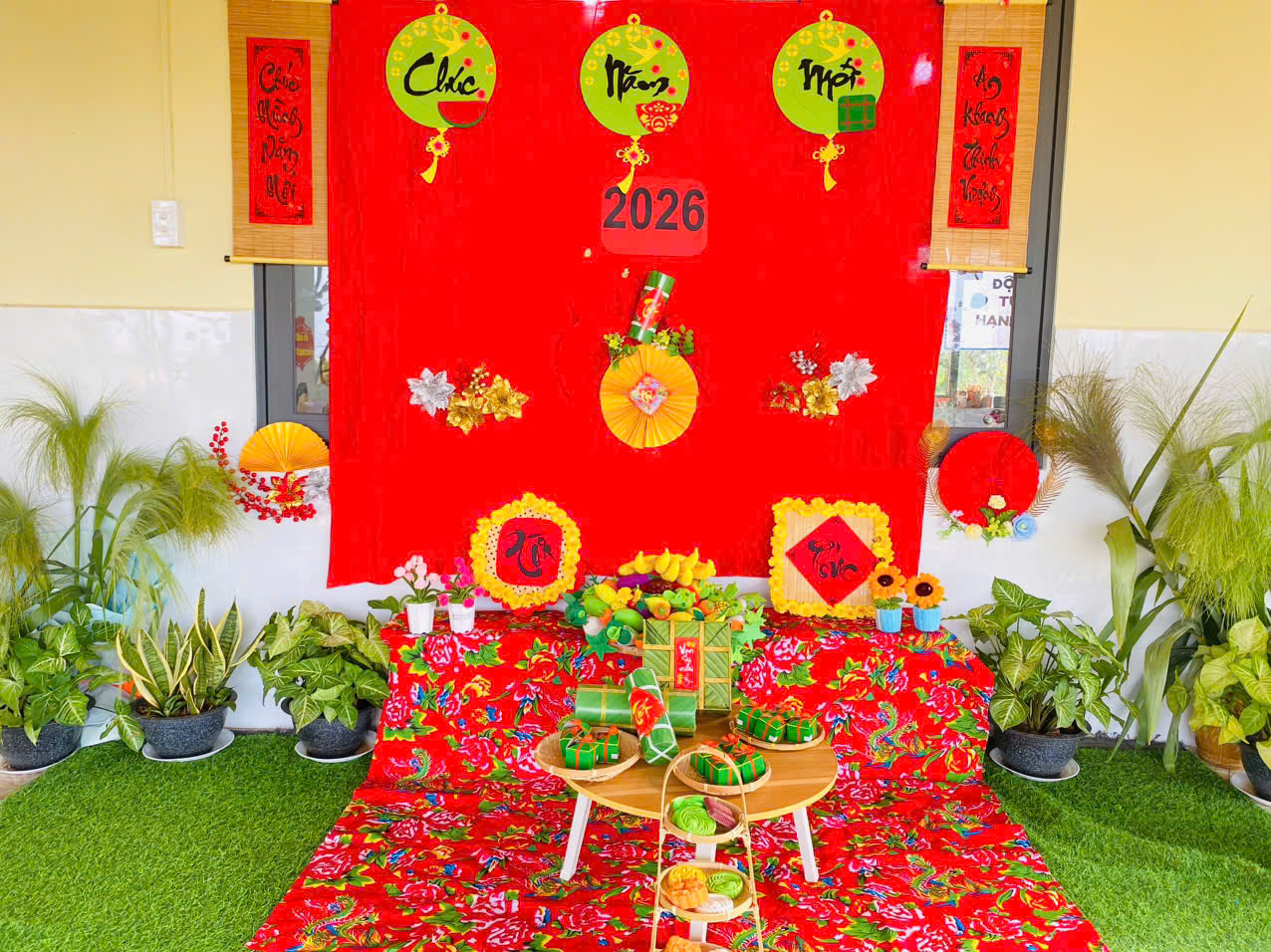 - Trang trí lớp học: Các lớp học đang được trang hoàng lộng lẫy với cờ hoa, đèn lồng, câu đối đỏ, và những bức tranh, sản phẩm do chính tay các bé tự làm trong các giờ hoạt động tạo hình. Hình ảnh hoa đào, hoa mai, bánh chưng, bánh tét, và các biểu tượng ngày Tết quen thuộc đang tràn ngập không gian lớp học, mang đến một cảm giác xuân rộn ràng ngay từ khi các bé bước vào trường.